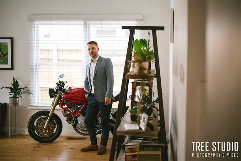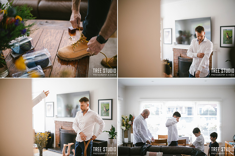 On the day, our Melbourne wedding photographer started with the groom to capture his getting ready wedding photography with the boys. We utilized the spacious living room for groom preparation photos as it offers a rustic couch, windows as well as a Ducati bike as backdrop for wedding photography.