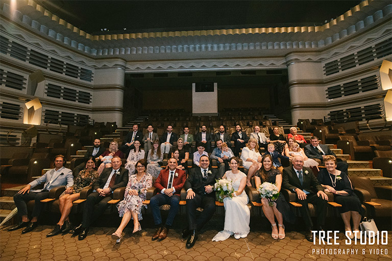After the couple’s wedding ceremony, it’s then time for our wedding photographer to do a big group shot with everyone. However, instead of doing it in the traditional way which the wedding photographer shoot from above. With the unique setting of the Sun Theatre, our wedding photographer arranged all the guests to sit on their chair with the newly weds in the middle.